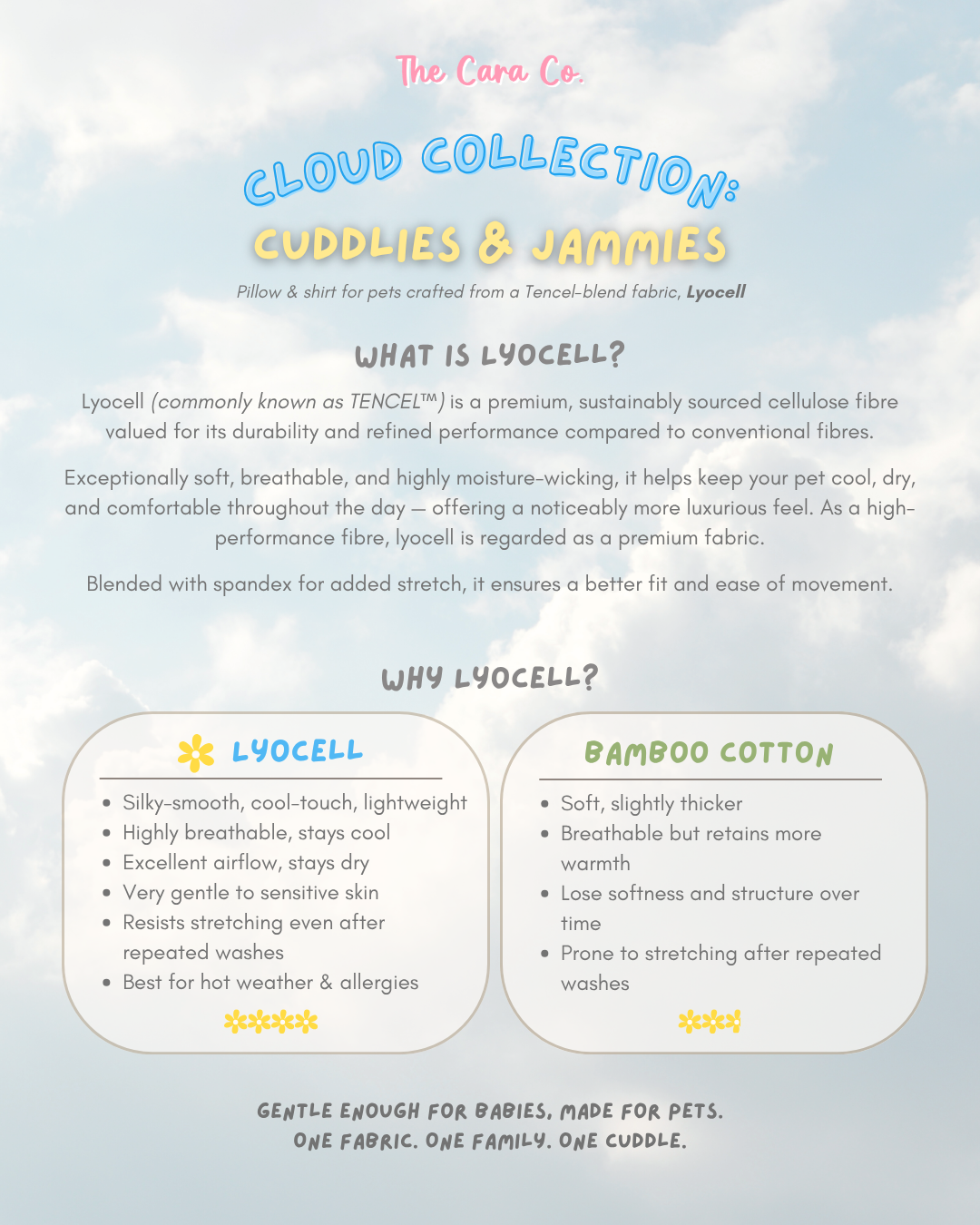 The Cuddlies Pillow, crafted from a Tencel-blend fabric with 95% Lyocell and 5% Spandex, is silky-smooth, breathable, and naturally temperature-regulating. Its gentle stretch and hypoallergenic touch make it perfect for both sensitive skin and fur.